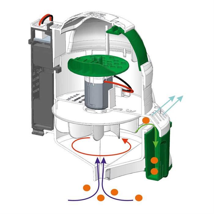 Bir uzatma milinin ve fanın bağlı olduğu çift eksenli bir elektrik motoru ile donatılmış olan bu küçük robot, toz ve kırıntı gibi küçük atıkları içerisine çekebilmektedir.